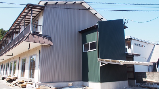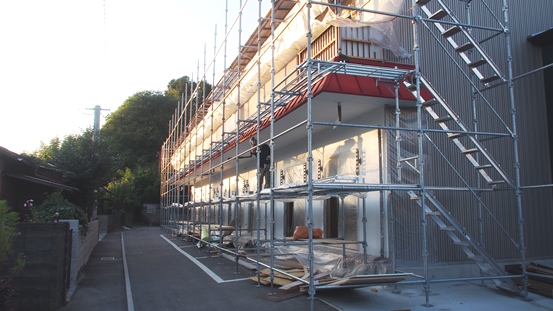 東西壁面の改修工事 東西の壁面をガルバリウム鋼板壁に改修し、2階へ通じる階段を壁付き折り返し階段に変更しました。入り口前の駐輪場に屋根を取り付けました。 コーポ新和Annexのイメージが一新! 内装の全面改修も順調に進んでいます。