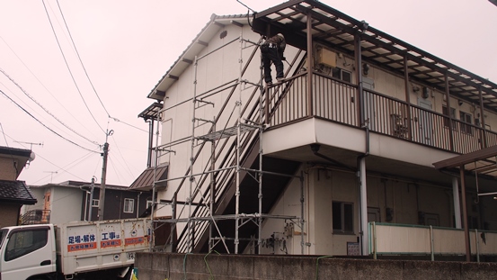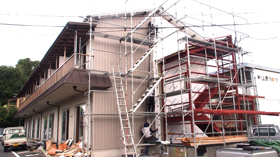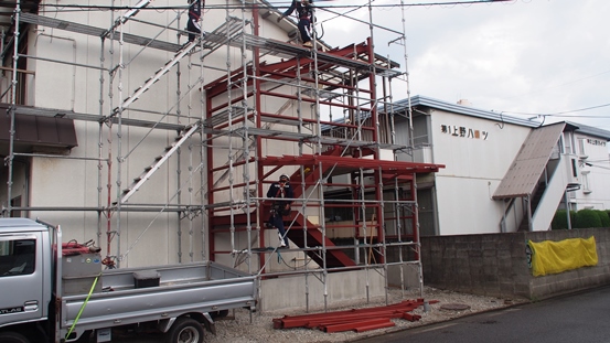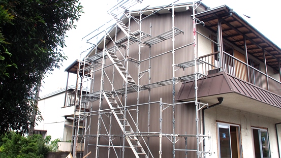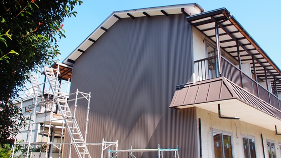 東西の壁面をガルバリウム鋼板壁に改修し、2階へ通じる階段を壁付き折り返し階段に変更しました。入り口前の駐輪場に屋根を取り付けました。