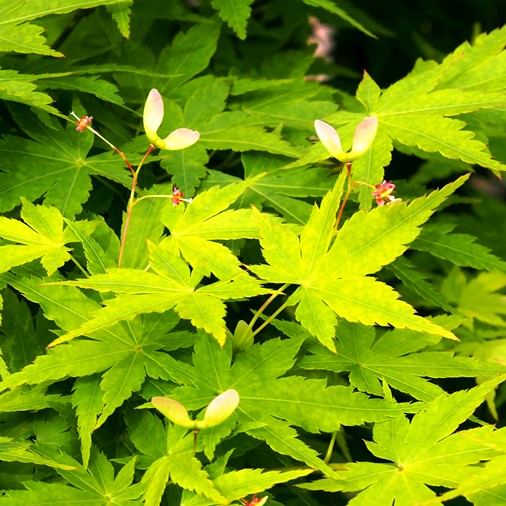 線香花火みたいな小さな花を無数に咲かせ、花が終わり始めると、とてもユニークな形をした種が木に無数にぶら下がっている様子を見ることができます。この形を「プロペラ」と表現する人もいれば、ドラえもん世代は「タケコプター」と言う人も居そうですねぇ。