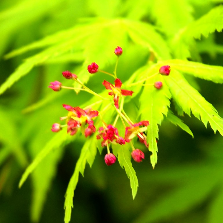 我が家のシンボルツリーのイロハモミジの新緑がきれいです。赤い小さな花が咲きました。