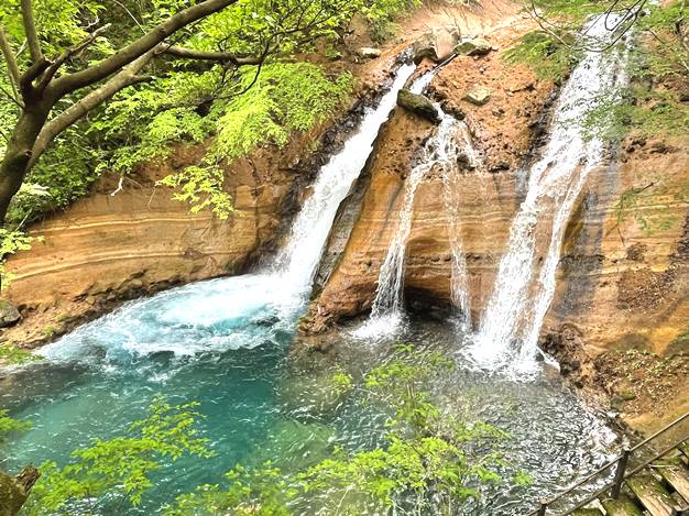 原生林が残る黒岳の森の中、木々の間を通る遊歩道を抜け、木で作られた橋を越えると、こんこんと湧き出る、透明度の超高い薄いブルーをした湧水群です。湧水は、湧出量が1日約2万トン。多くのミネラルを含んだまろやかでおいしい軟水は「日本名水百選」にも選ばれています。