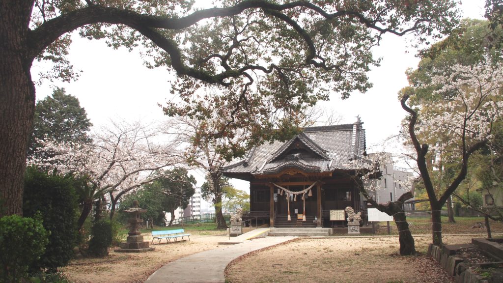 満開の桜の近くに小さな神社があり、境内にもきれいな桜が咲き誇っていますよ。